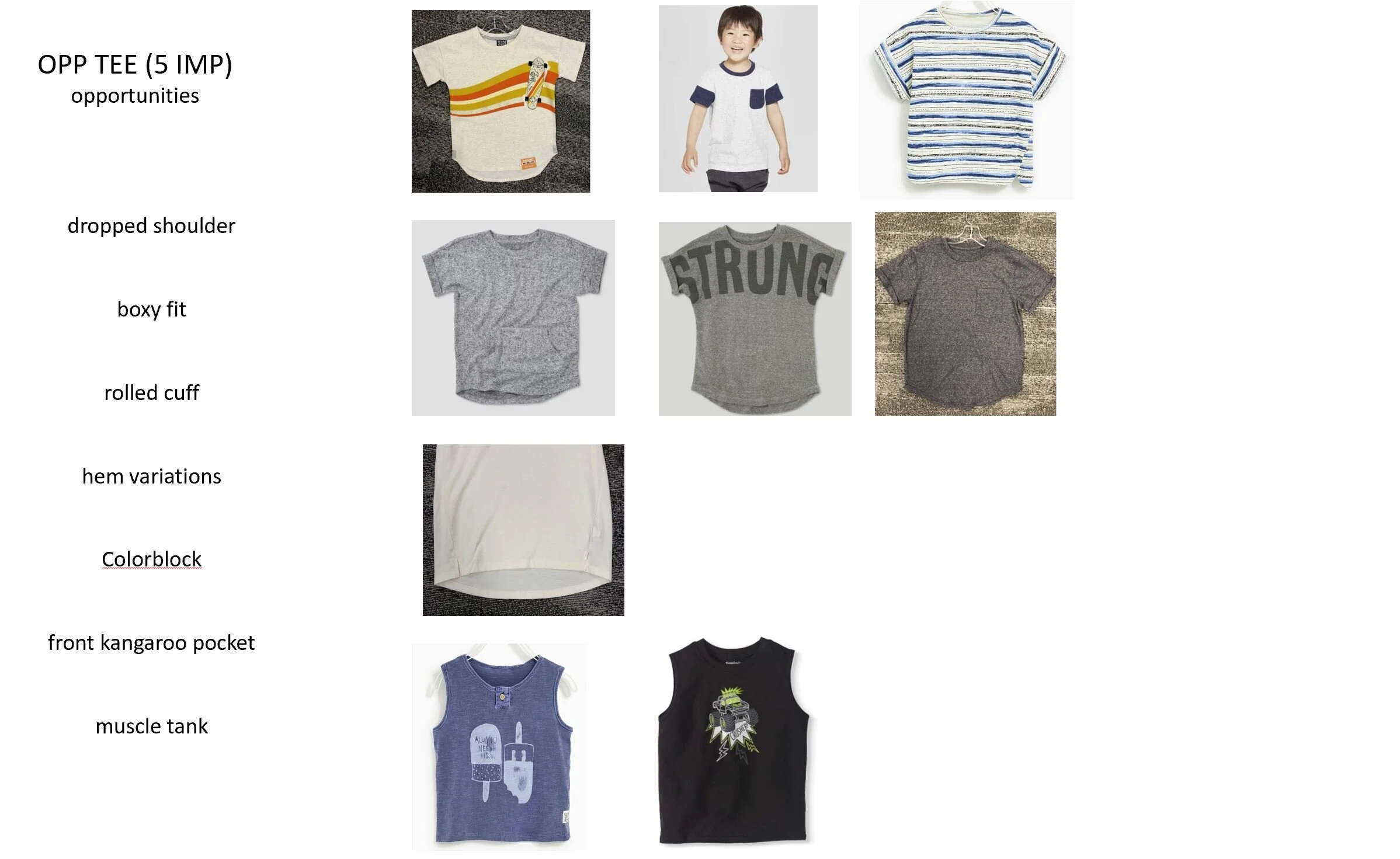 Similar to the white space opportunity for toddler boys knit shorts, below is the process of market research and design development for two new knit t-shirt designs that were eventually added to the in-line toddler boys assortment.