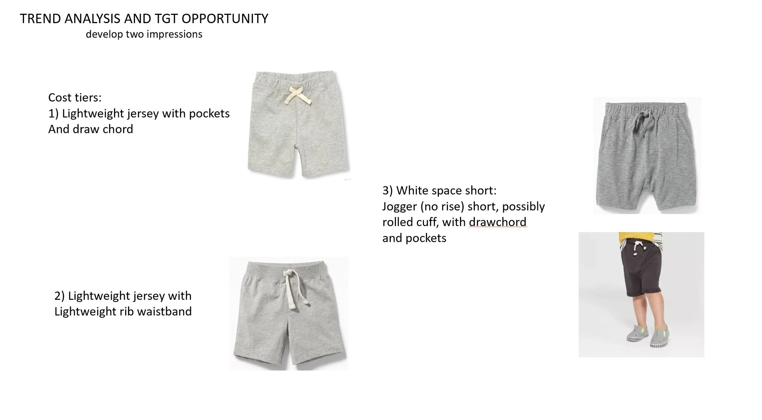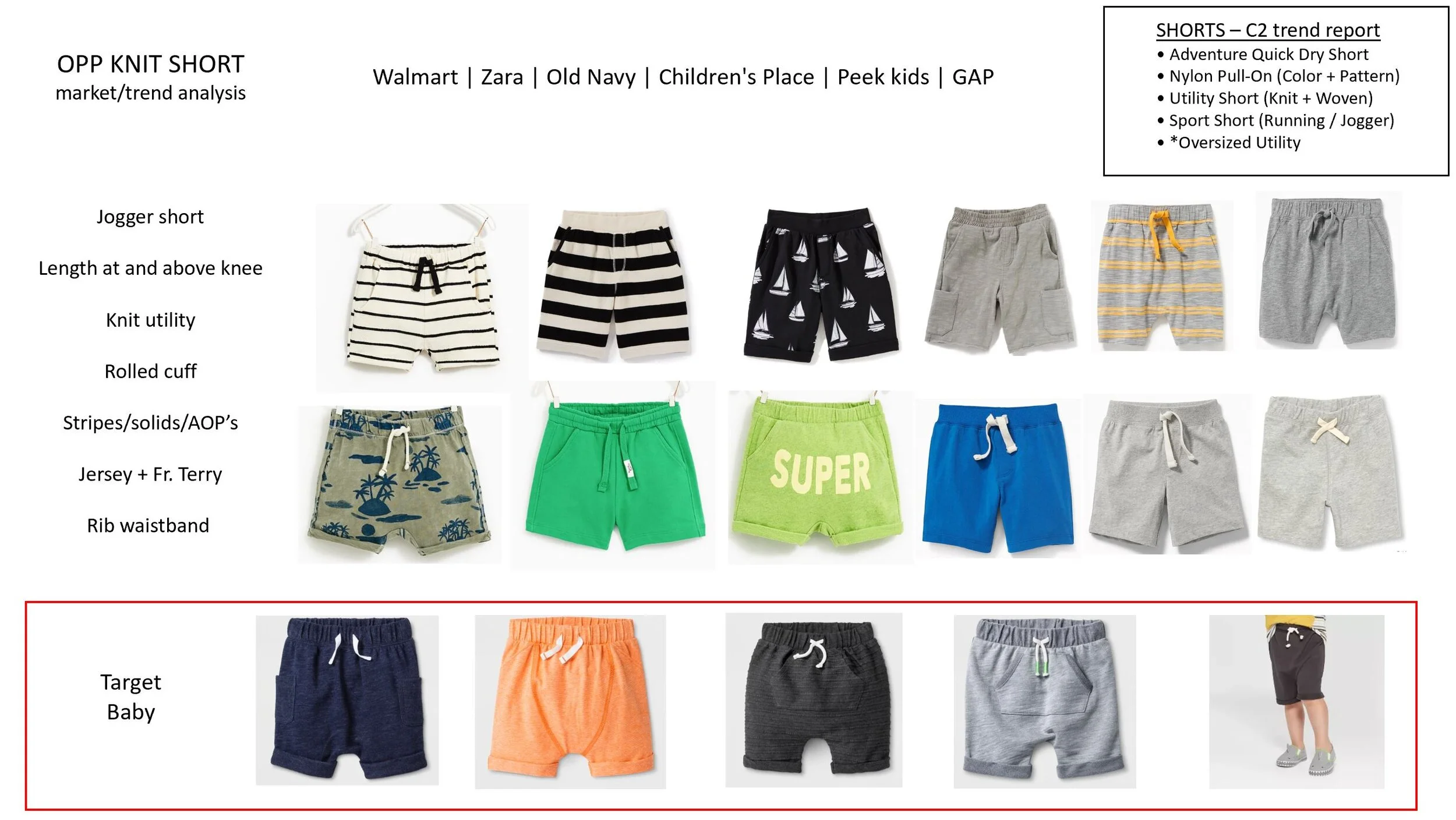 My summary of benchmark brand market research below, demonstrated for buyers the trends in toddler boy knit shorts which showed opportunities in Target's assortment, compared to competitor brands.